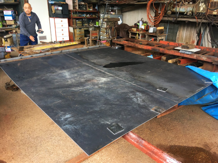 巨大鉄板庇、補強部材の位置を鉄工所で打ち合わせ。この後メッキ処理。