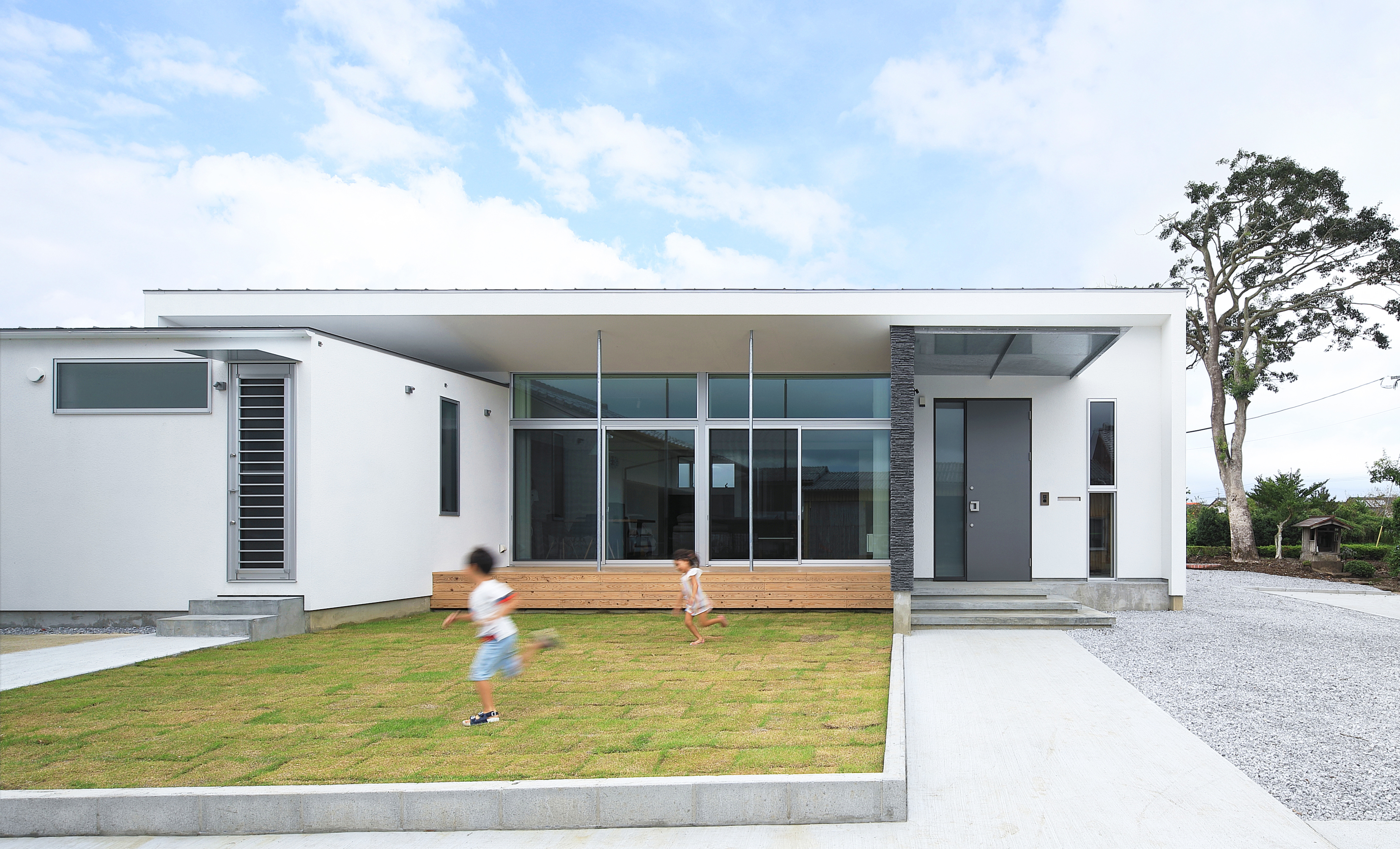 竣工写真載せました。仲良し兄妹が走り回れる伸びやかな平家になりました。